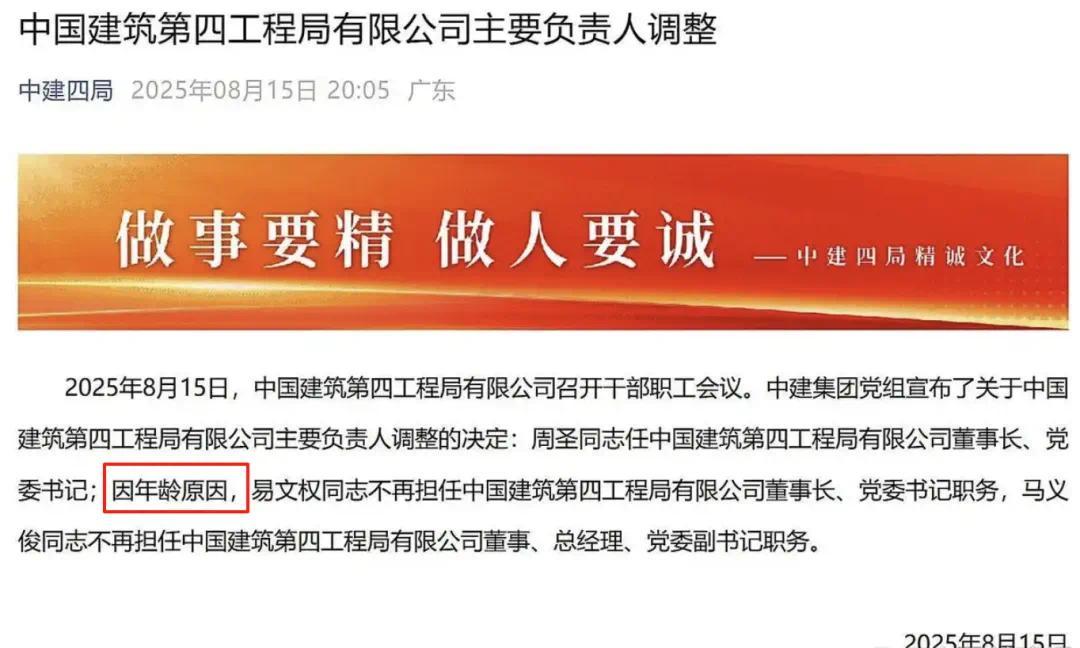 对于公司董事长、总司理职务调整一事,净资产约222亿元,推进规模成长。中建四局官网已更新董事长致辞。